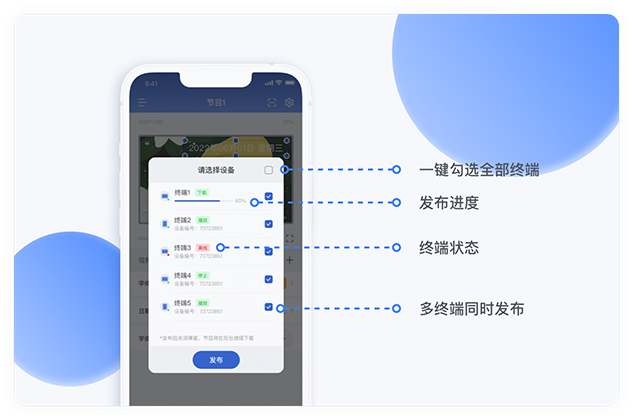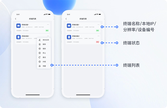 无需到达终端设备前,即可查看终端在线/离线/播放/停止等登录状态,省时省力;支持远程控制终端播放/停止/重启/休眠/唤醒/删除/名称修改等操作。