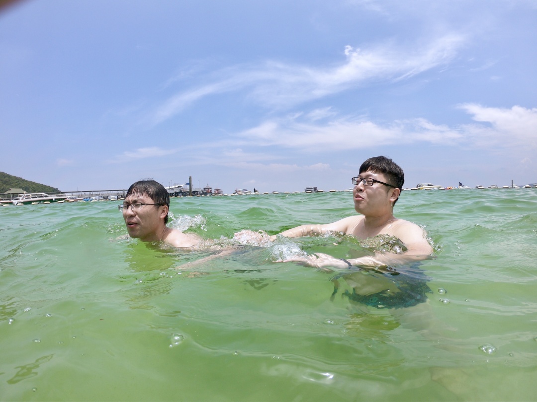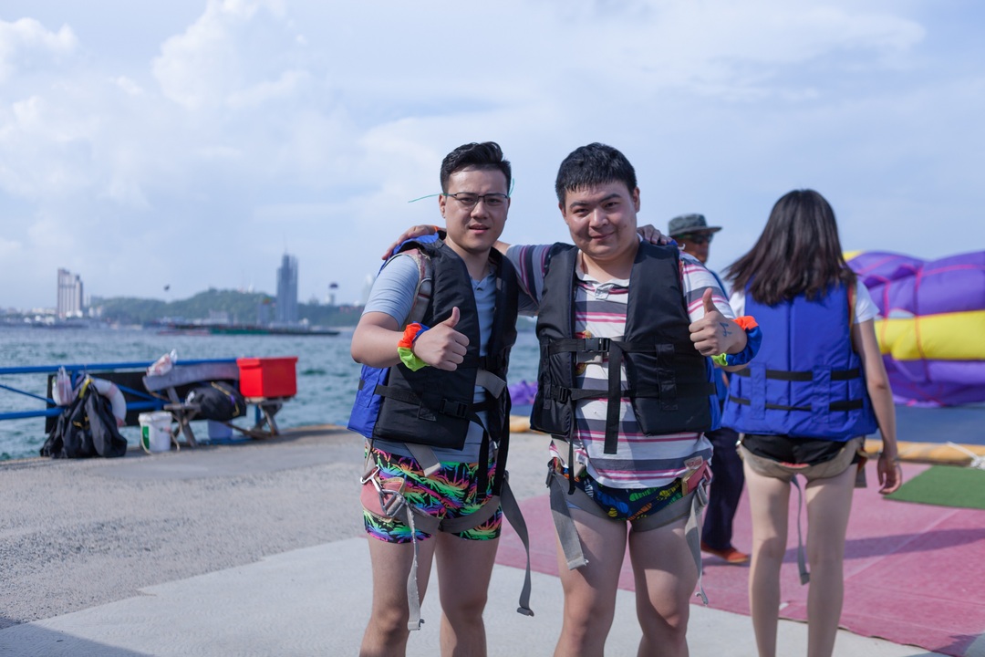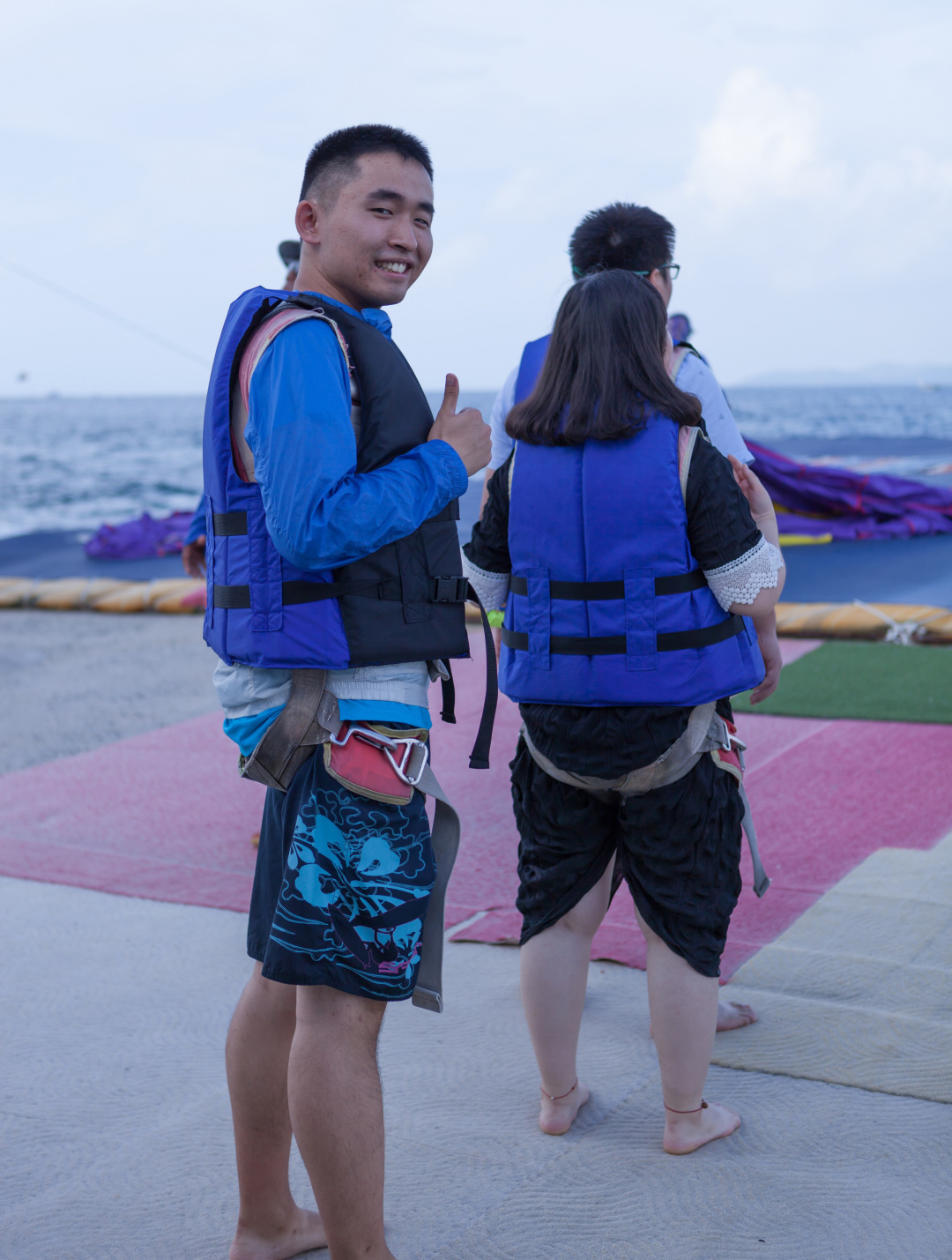 正值泰国的雨季,太阳不太大,海却很蓝??雌鹄瓷跏谴碳さ目罩蟹扇?,一些恐高的小伙伴跃跃欲试,在大家的鼓励下,终于体验了一把放飞自我。