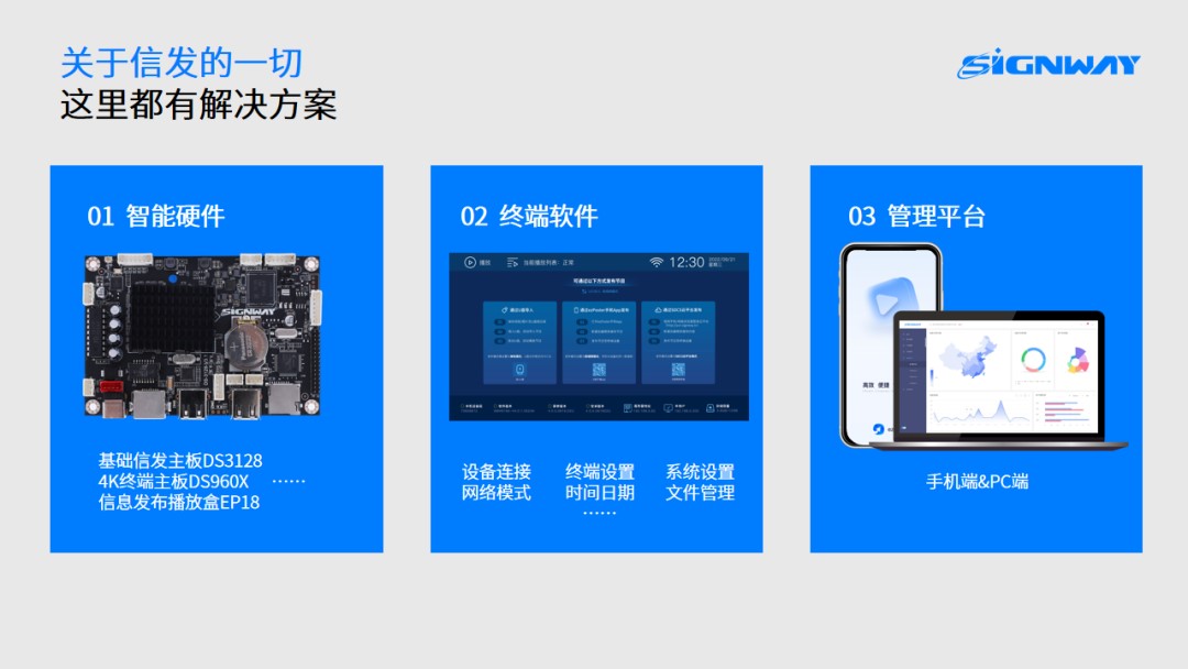 专注于商用显示领域,欣威视通已深耕12年。围绕商显“信息发布”这一重要环节,欣威视通打造了包含智能硬件、终端软件以及管理平台的信息发布一站式整体解决方案。