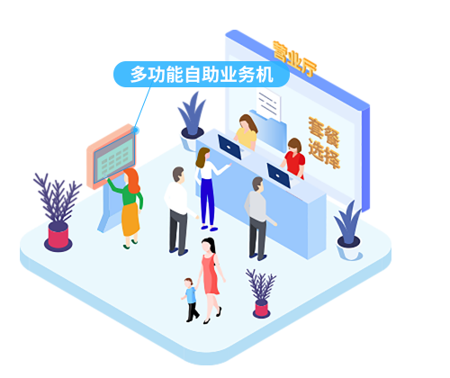 对接营业厅系统,以安卓智能主板为主要硬件,外接读卡器、扫描仪、打印机、摄像头等外设,实现多业务自助缴费、广告投放、业务查询、视频对讲、远程管理、24小时服务等增值功能,提升客户满意度。